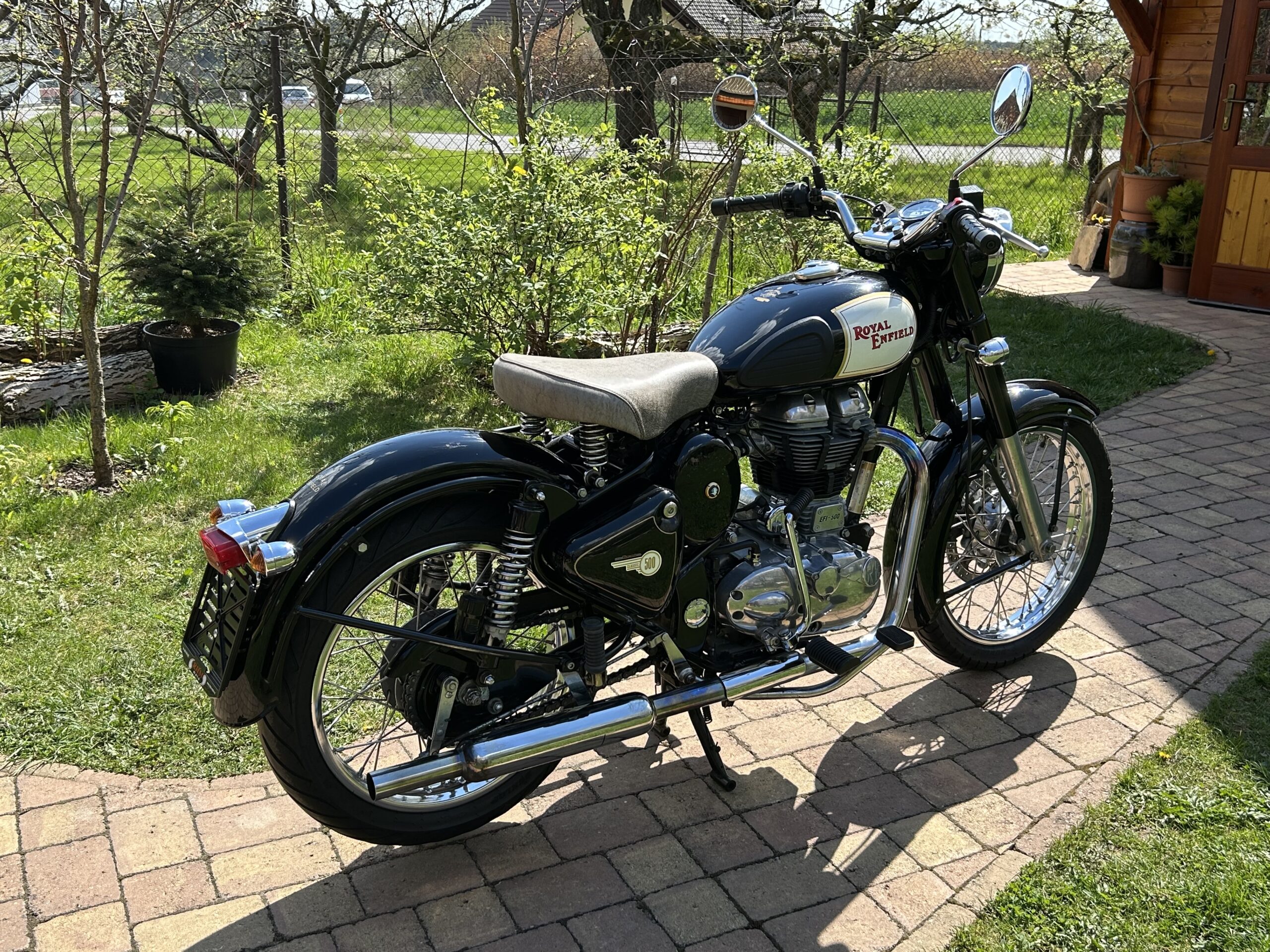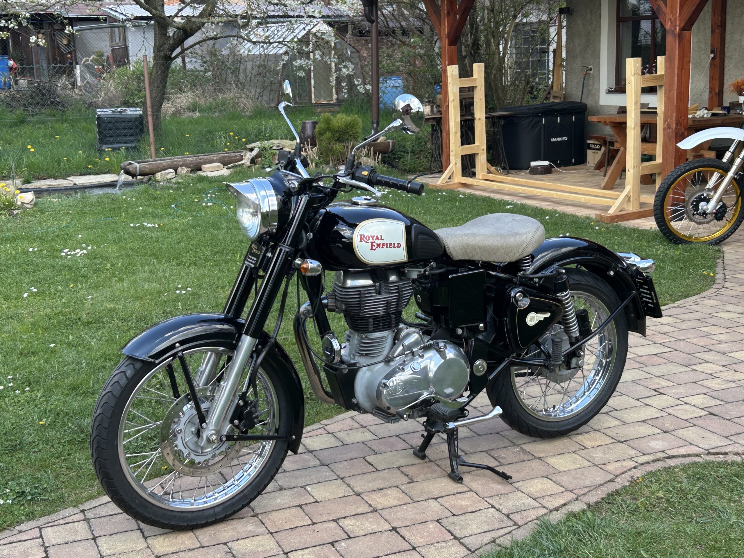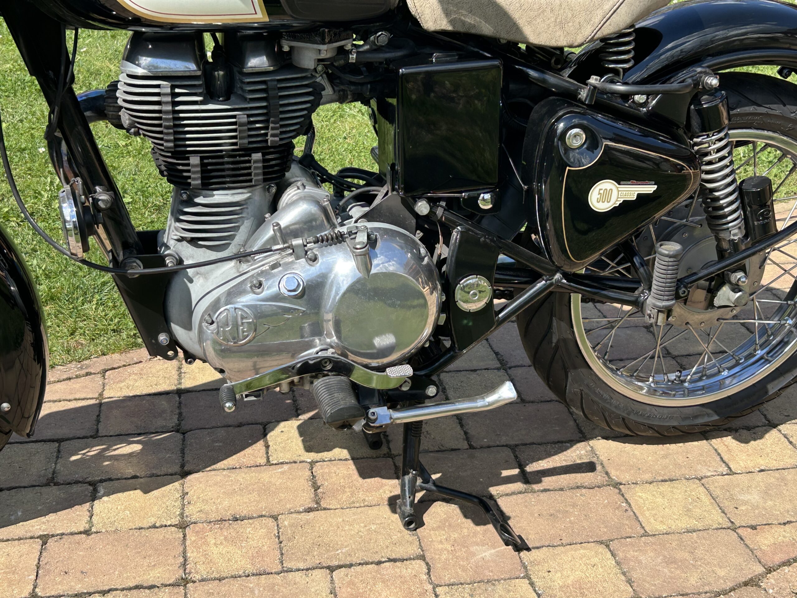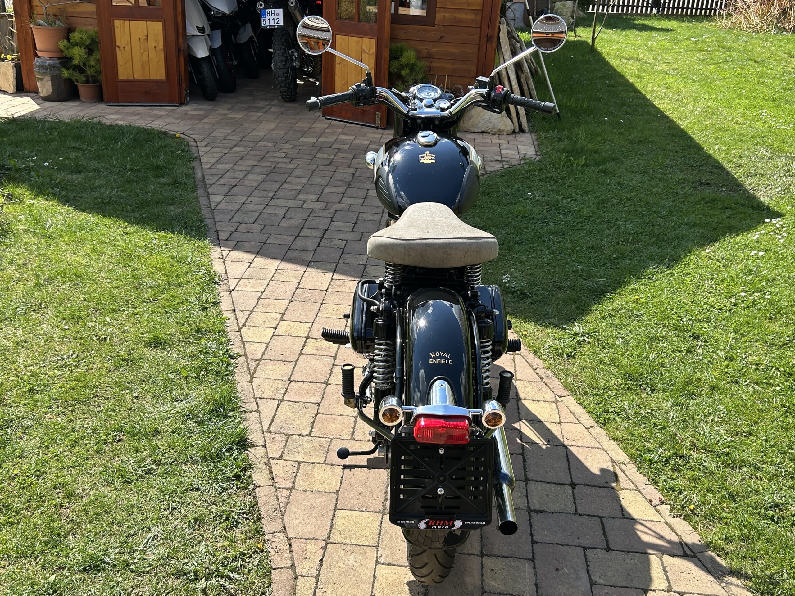 Nabízíme krásný Royal Enfield v perfektním stavu. Vintage grafika nádrže a bohatým využitím chromu. Nyní po servisu u nás, mj. promazání a kontrola ložisek, přetěsnění předních vidlic. S doplňky – vyšité sedlo, 2. sedlo ve stejném stylu, držák a brašny. Dovoz z Itálie.