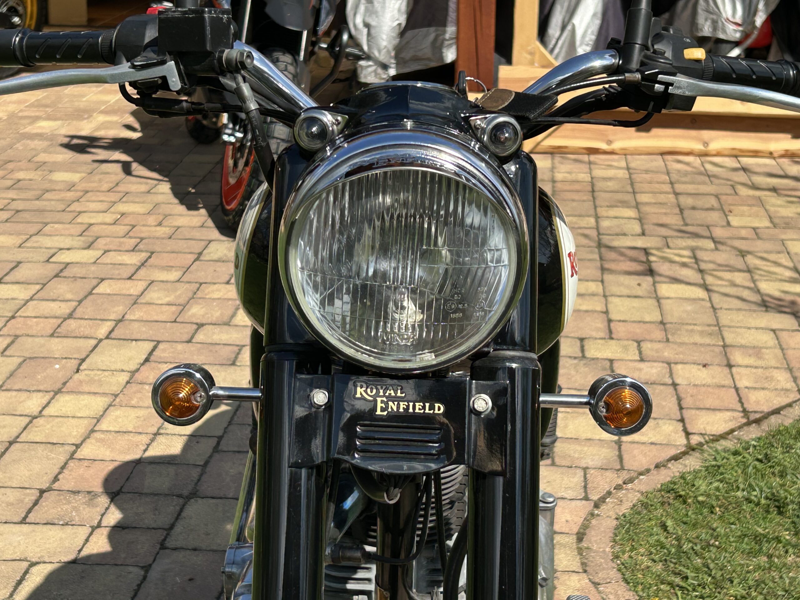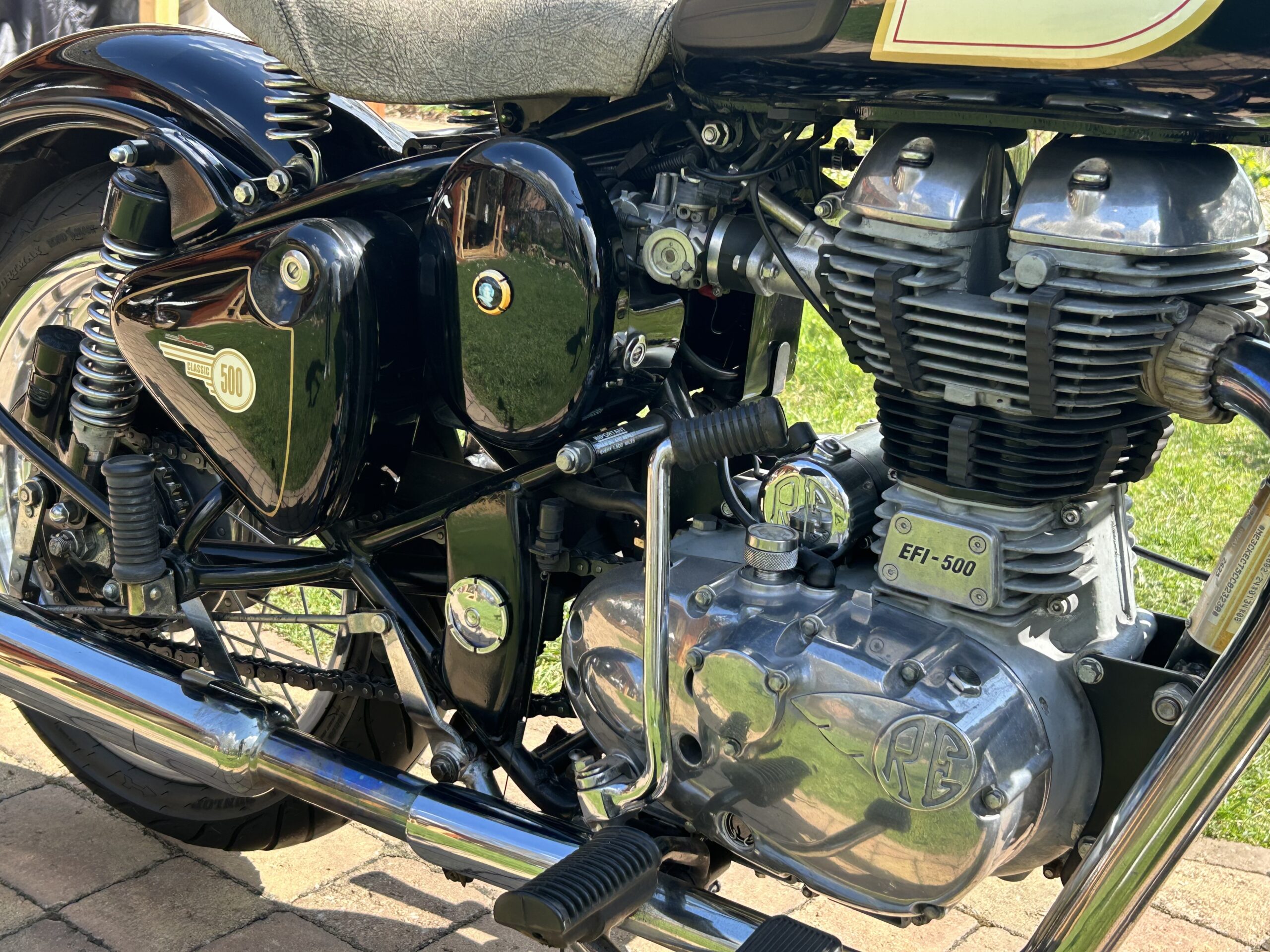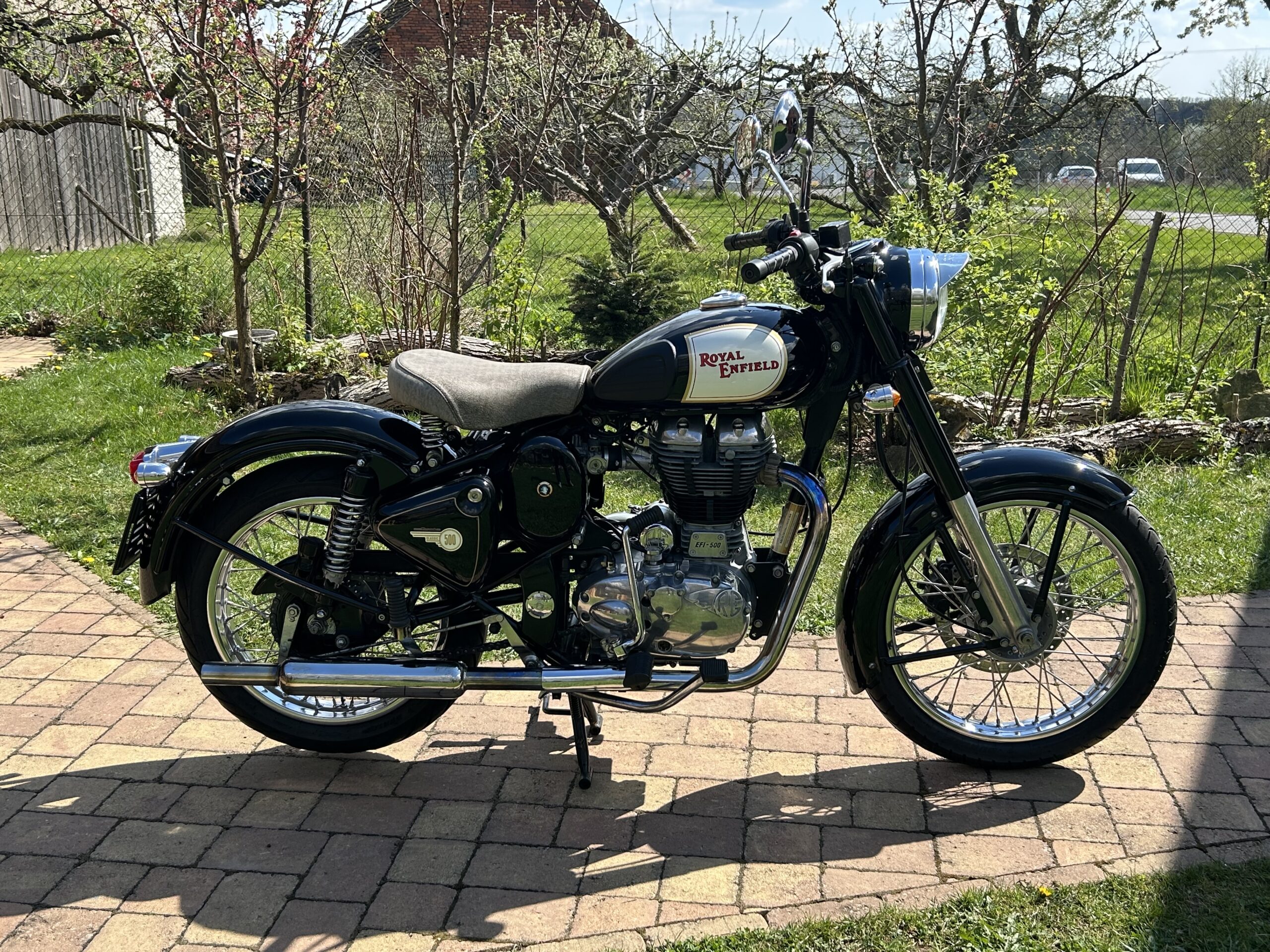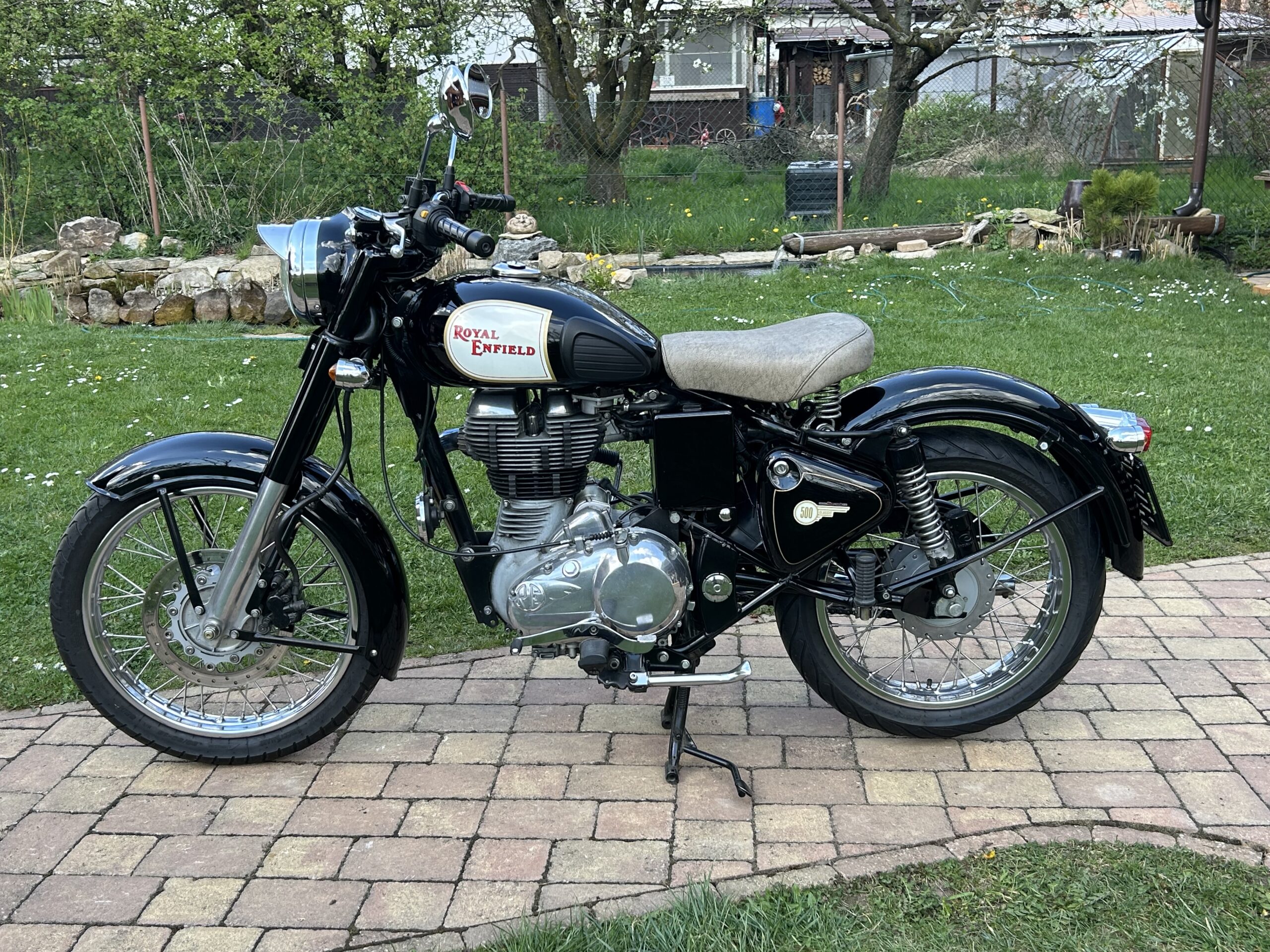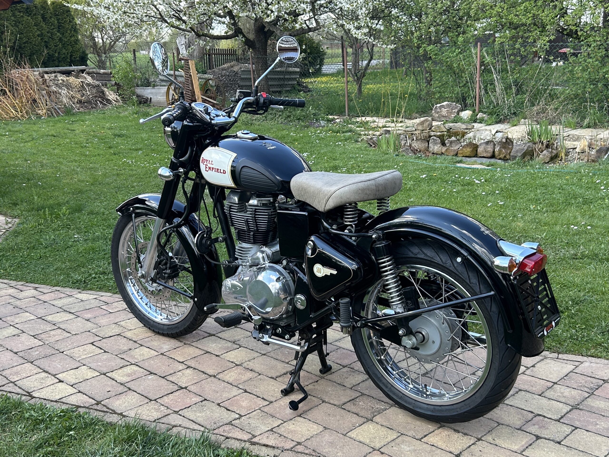 Nabízíme krásný Royal Enfield v perfektním stavu. Vintage grafika nádrže a bohatým využitím chromu. Nyní po servisu u nás, mj. promazání a kontrola ložisek, přetěsnění předních vidlic. S doplňky – vyšité sedlo, 2. sedlo ve stejném stylu, držák a brašny. Dovoz z Itálie.